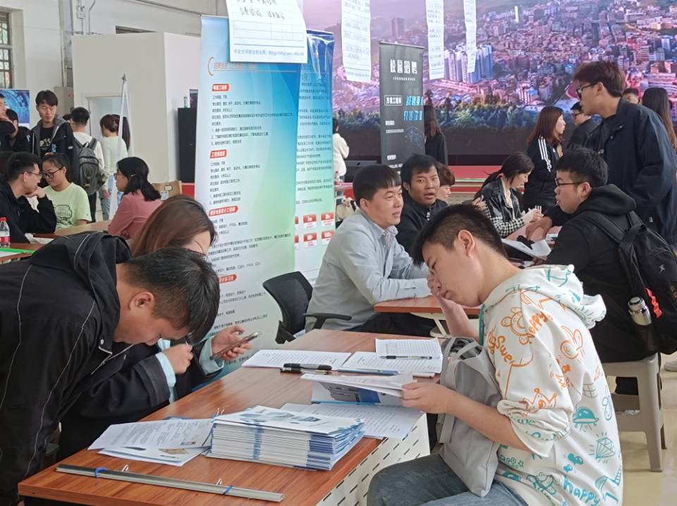 招聘会现场人潮涌动,熙来攘往。毕业生们手持简历,向企业了解岗位要求,展示专业知识和技能,询问岗位发展前景;企业招聘人员耐心详细介绍企业的招聘要求、薪资待遇、工作环境以及未来发展空间等。
