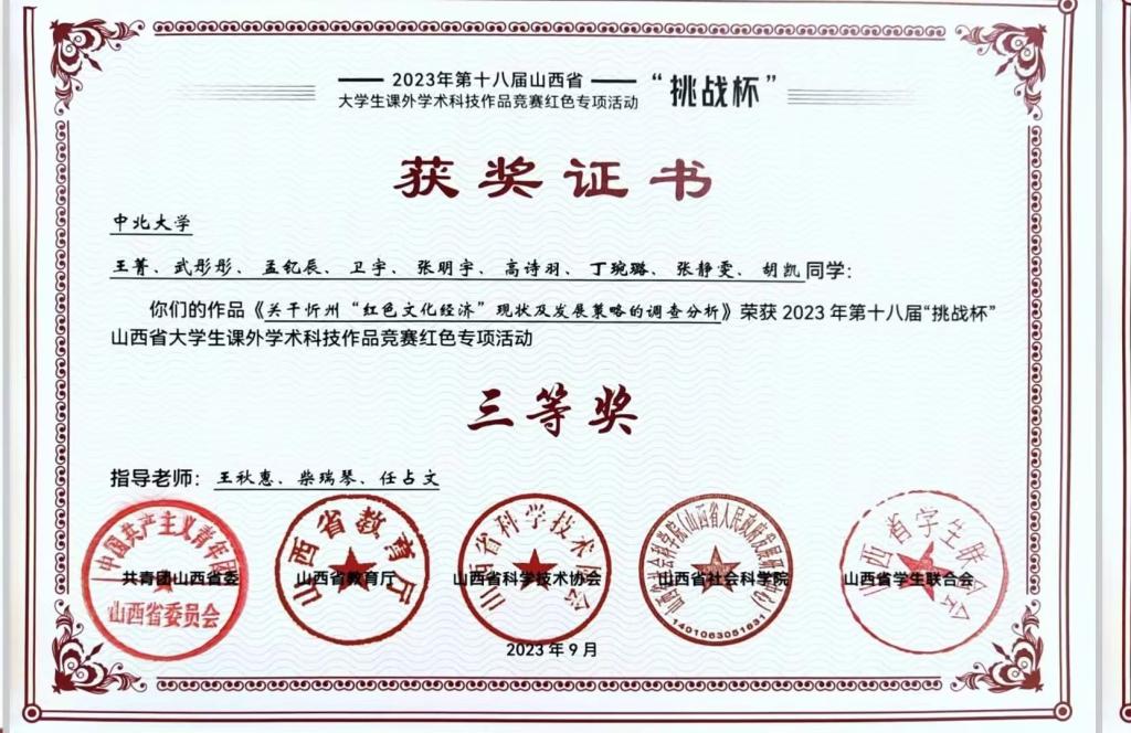 表里山河”团队(指导老师:王秋惠、柴瑞琴、任占文)和“弘扬太行精神,赓续红色血脉”团队(指导教师:闫婷、王彪)在“红色专项”活动中均获得省级三等奖,并晋级国赛项目。