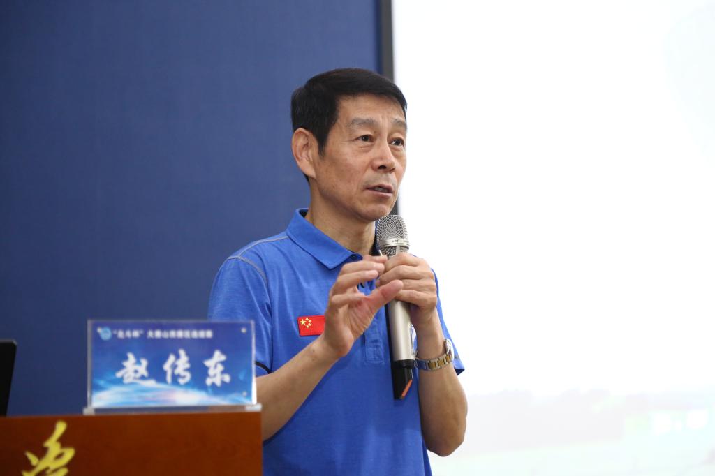 赵传东作航天科普专题讲座。“在学习理论知识的那段日子里,我们的公寓楼总是最晚熄灯的”“在一天的高强度训练结束之后,吃饭的手都在不停的颤抖”,作为中国首批航天员中的一员,他以自己的亲身经历向大家讲述了航天员艰苦的训练生活并带领大家重温了自己当年投身载人航天事业时的宣誓过程。