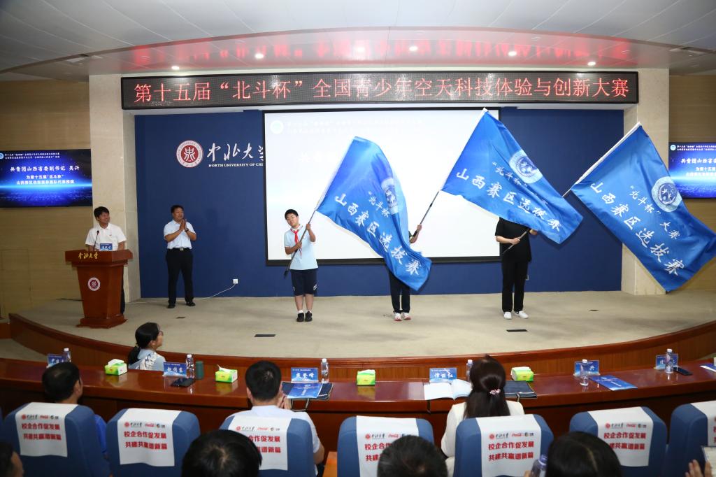 共青团山西省委副书记吴兴为第十五届“北斗杯”山西赛区选拔赛参赛队代表授队旗。