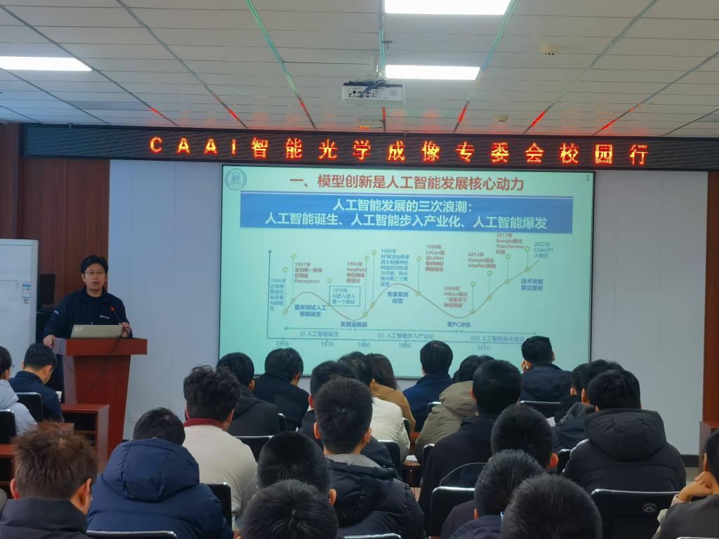 在科学楼B座715学术报告厅成功举办了中国人工智能学会(CAAI)智能光学成像专委会校园行相关活动。本次活动邀请清华大学软件学院丁贵广教授和中科院计算所李亮研究员开展了两场学术讲座,主题分别为《深度学习模型压缩加速技术》和《跨模态细粒度理解与生成》,讲座由副院长刘吉主持,院长陈平出席,学院广大教师和研究生积极参与了此次讲座。