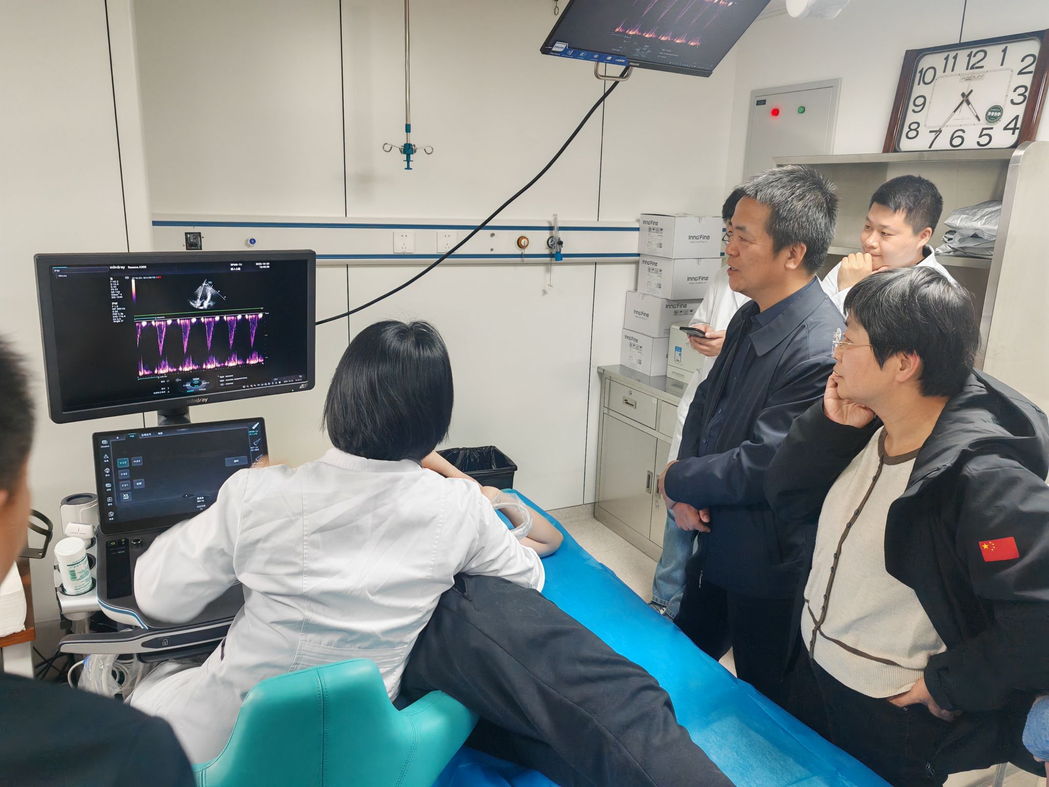 王兴华主任带领学院一行参观超声诊室,对超声医学的临床应用场景与实际问题有了更直观的认识,进一步增进科研人员对临床需求的理解。双方就多普勒超声信息源的量化处理、心肌组织的成分分析、肌骨微细病变的超声分辨、介入治疗温度场的量化及与人工智能结合等方面进行了交流探讨。