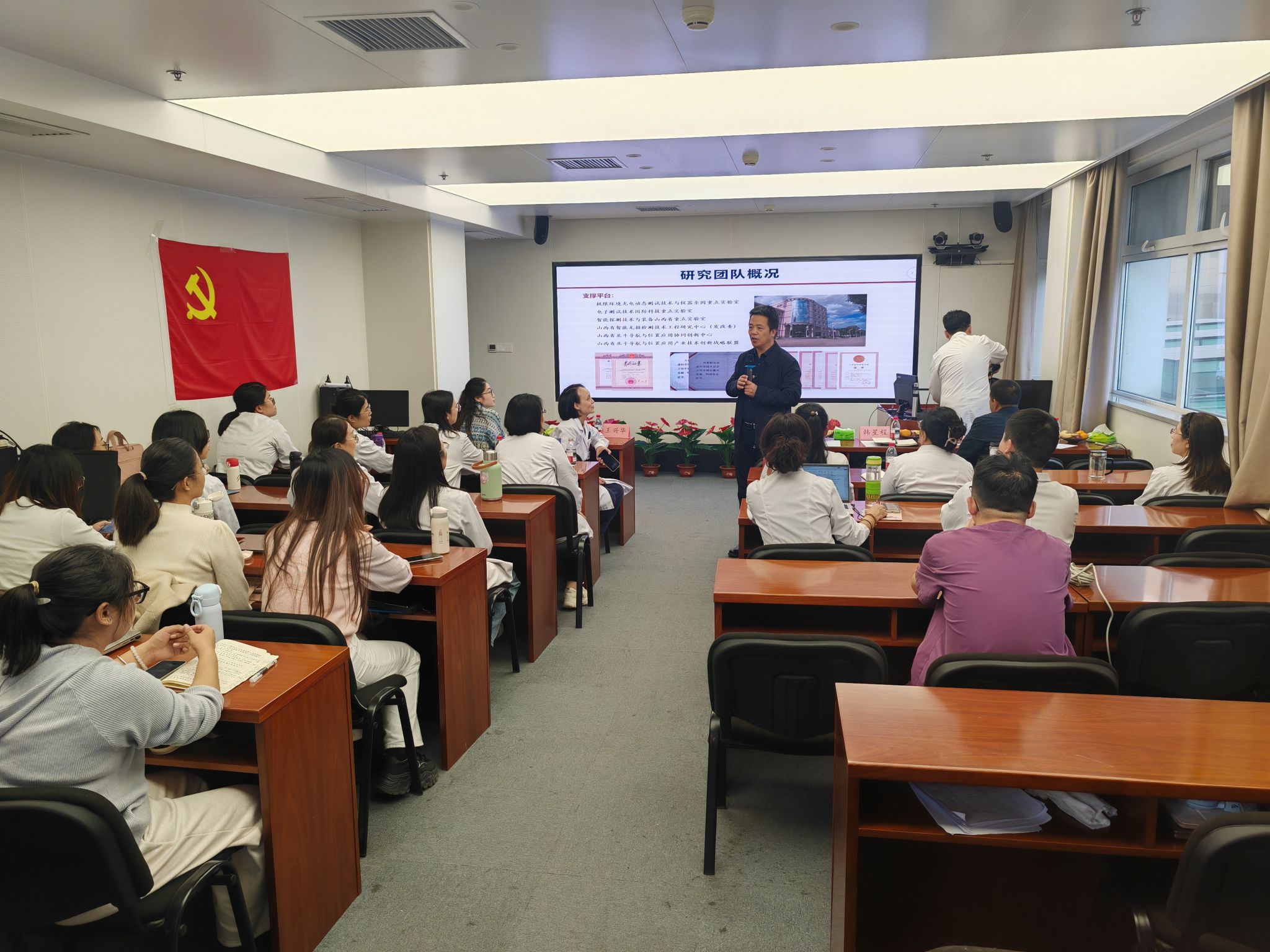 会上,王兴华主任对学院一行的到来表示热烈欢迎,并对山西二院超声科的发展历史及组织架构进行了详细介绍。王黎明院长介绍了学院学科布局、科研平台与人才队伍等方面的情况,并对学院在信息探测、信号处理、智能系统等方向的科研成果应用进行详细说明。