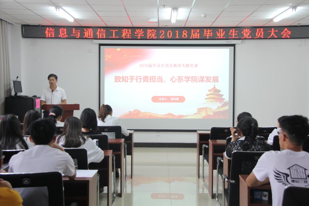 6月22日上午10时,信息与通信工程学院2018届毕业生党员大会在院楼715会议室顺利召开,本次毕业生党员大会以系列微党课的形式举行。院党委书记曹凤才、院长杨风暴、院党委副书记兼副院长魏媛媛、各学生党支部书记、全体2018届毕业生党员参加了本次大会,会议由院学生科科长任雁主持。