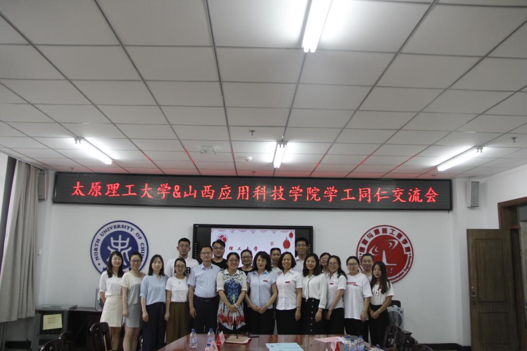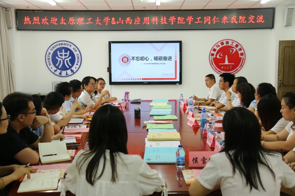 2019年6月19日下午,太原理工大学材料科学与工程学院党委副书记李栩一行7人、山西应用科技学院学工部部长白香兰一行10人来我院调研学生教育管理、辅导员队伍建设、辅导员工作室建设等工作。学院党委副书记兼副院长魏媛媛、学生科科长任雁、团委书记闫婷及学院全体辅导员参加了本次座谈会。