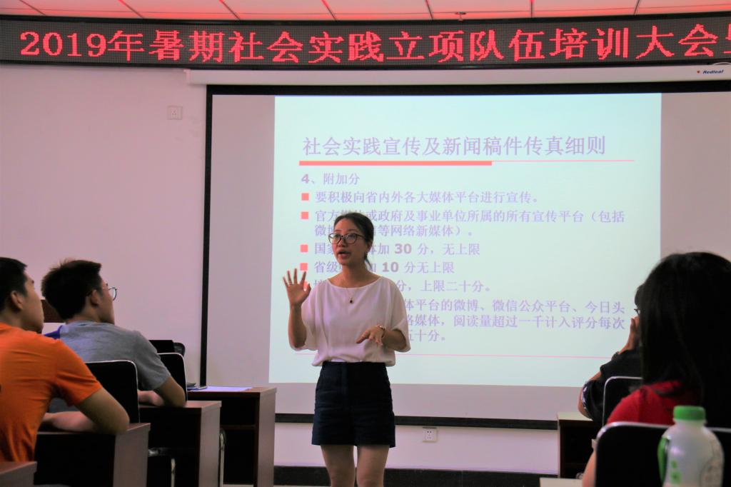 首先闫婷老师就暑假社会实践的经费问题、安全问题、实践过程中需注意的事项、实践过程中的宣传细则、团队实践结束后需要提交的材料五个方面进行讲解。