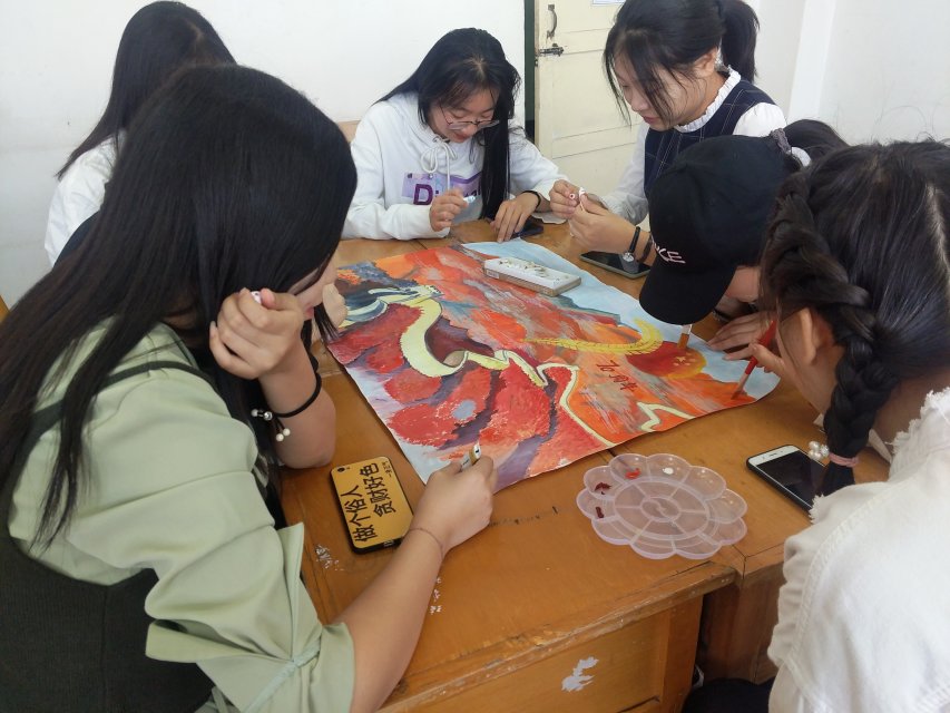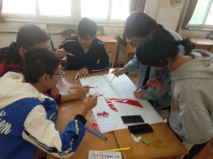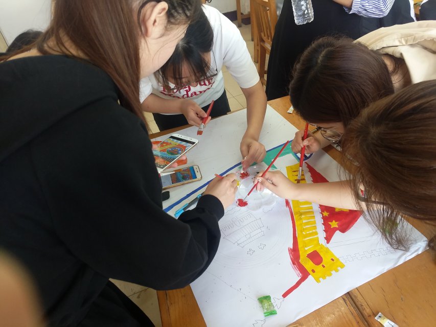 本次活动主要分为三个部分:1.各支部协商并确定好绘画主题;2.各支部合力现场作画;3.各支部展示作品并讲解作品的意义。整个绘画过程井然有序,大家齐心协力,各显身手,一双双灵巧的手下流淌着对祖国的热爱之情。