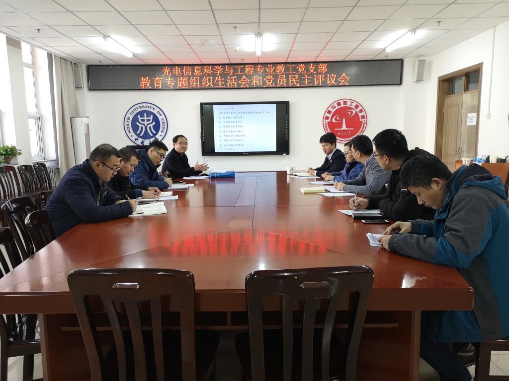 光电信息科学与工程党支部在科学楼713会议室组织召开“不忘初心、牢记使命”主题教育专题组织生活会和党员民主评议会,支部全体党员参加会议。会议由党支部书记张志伟主持。