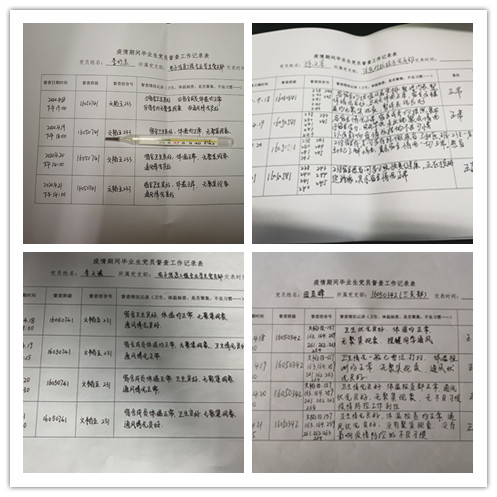 结合实际,在学生返校后,为党员配备了抽检体温的额温枪、医用防护口罩等基本物资。党员第一时间与宿舍对接,每日不定时巡查学生公寓楼道是否有聚集人群,及时劝阻;督查宿舍卫生、通风、消毒情况;《宿舍登记表》上是否签字;是否有聚集游戏、打牌、抽烟、酗酒等不良行为等,督查过程情况记录在《党员督查工作记录表》上,并及时提醒、现场整改。