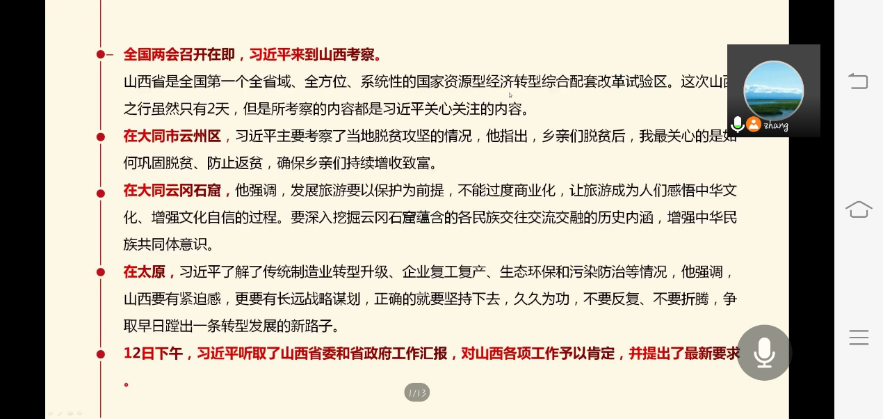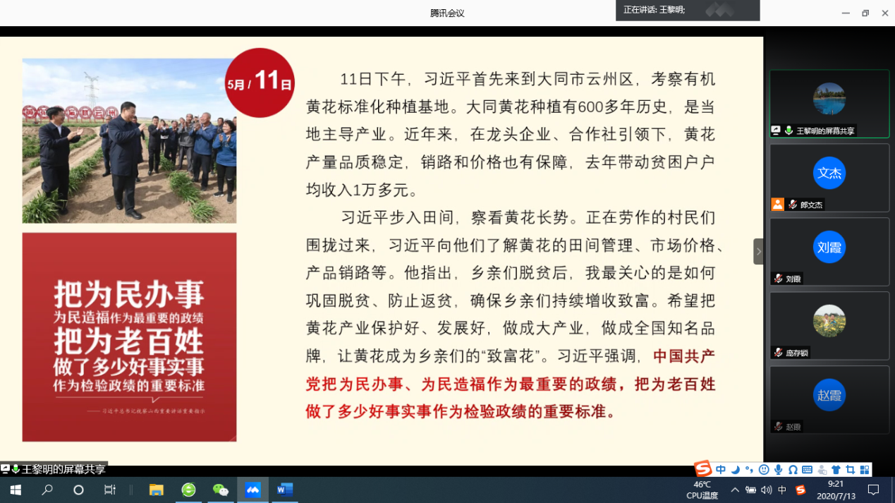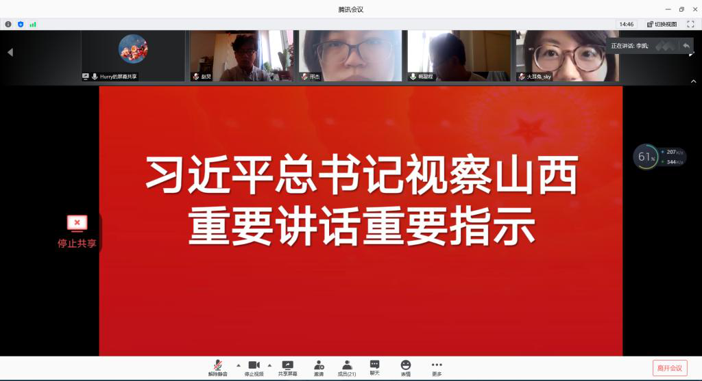 领学活动中,党委委员们以“重温习近平总书记重要讲话,砥砺奋进谱新篇”为主题,带领全院全体师生党员重温了习近平总书记视察山西的足迹和讲话,并结合自身感受习近平总书记重要讲话精神对我们工作、学习、实践的指导作用。通过领学,学院师生党员对习近平总书记视察山西的讲话精神和重要指示有了更深、更细的认识和理解,深刻体会到习近平总书记对山西的关心和关怀,为深刻学习领会习近平总书记重要讲话重要指示提供了科学的学习方法。党委委员们要求学院党员师生要牢记总书记的殷殷嘱托,坚持不懈抓好党内政治生态建设,加强理想信念教育,并要求全体党员同志发挥先锋模范作用,抓住省委支持学校率先发展的机遇,克服新冠肺炎疫情带来的不利影响,不忘初心,砥砺奋进,牢牢扛起攀登科学高峰的使命;牢牢扛起为转型发展提供科技支撑的使命,立足服务山西转型发展大局,着力科研成果转化和产业化,打造转型发展竞争新优势;牢牢扛起打造一流人才高地的使命,建设一流学科;牢牢扛起立德树人、培养人才大军的使命,立足山西、面向未来,深化教育教学改革,更好服务高质量转型发展。只争朝夕乘势而上,为实现我校双一流建设和百年百强的中北梦贡献自己的力量!