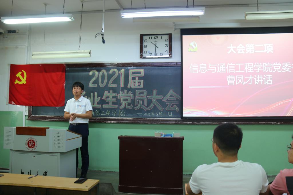 院党委书记曹凤才在致辞对同志们圆满毕业表示了衷心的祝贺;对毕业生党员为学院所做贡献表达了感激之情!并对毕业生党员提出了殷切希望:一是希望大家牢记党的宗旨、强化责任意识,在新的领域继续发挥党员的先锋模范作用,不忘初心,砥砺前行。二是正确对待眼前利益,保持清正廉洁,坚守底线,抵制诱惑,不断增强“四个意识”,坚定“四个自信”,做到“两个维护”。三是希望大家牢记“致知于行”的校训,常怀组织培养之恩、母校教育之恩,用行动诠释好一个合格党员的责任和使命,为母校添彩,为党旗增辉!最后,曹书记嘱托同志们要以最好的精神状态和工作业绩迎接建党100周年,祝全体2021届毕业生党员一路顺风!前程似锦!母校时刻欢迎大家常回家看看!