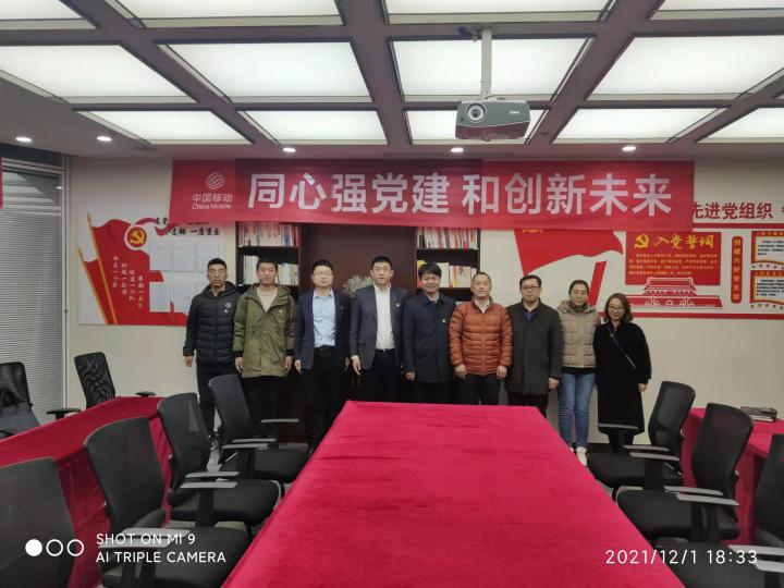 党委书记曹凤才与通信工程教工党支部书记王晨光带队,一行六人前往中国移动通信设计院开展党建结对共建活动,中国移动通信设计院王瑞峰院长、景岗副院长、薛云山所长、张刘涛经理以及支部委员等出席了活动。