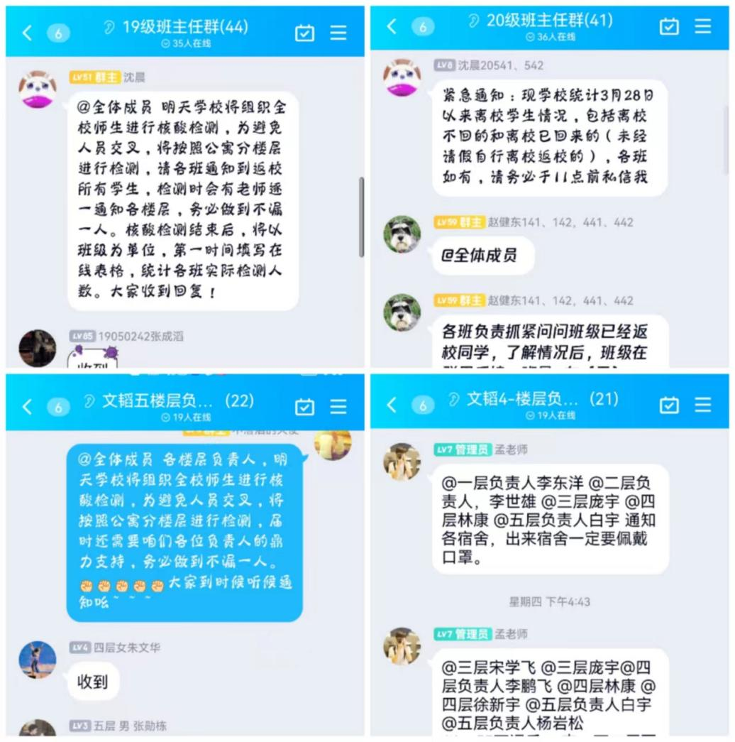为了在第一时间做好各项疫情摸排工作,成立了横向由“辅导员——楼层负责人——宿舍长”,纵向由“年级负责人——班主任——班长”为一体的网格化管理体系,迅速开展学生流调工作,精准掌握在校生人数、请假学生人数、红黄码学生人数、核酸检测人数等,确保排查工作不留死角、不落一人,为后续工作打下坚实的基础。