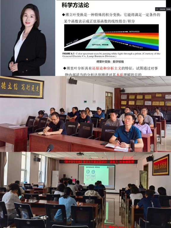 随后,田春娜教授对《数字信号处理》的课程概述、课程组成员、课程发展历史、使用教材、教学成果等方面进行了简要介绍;并对课程建设及改革措施进行了详细说明。介绍了在《数字信号处理》课程教学时,充分利用线上线下的资源优势,从学生认知能力培养、科学思维能力培养、工程和创新能力培养三个着力点进行专业课程的教学设计。田老师提出了案例式教学研究,并给出了多个案例,如:利用“车轮旋转”的视频来说明奈奎斯特采样定理;利用图示一步步展示DIF-FFT的推导过程,田老师建议在教学实践中要多列举生活中的案例、视频、图示来辅助学生理解、记忆。此外,田老师建议教学实践中要建设综合性习题库,让学生活学活用,真正把知识点串连起来。