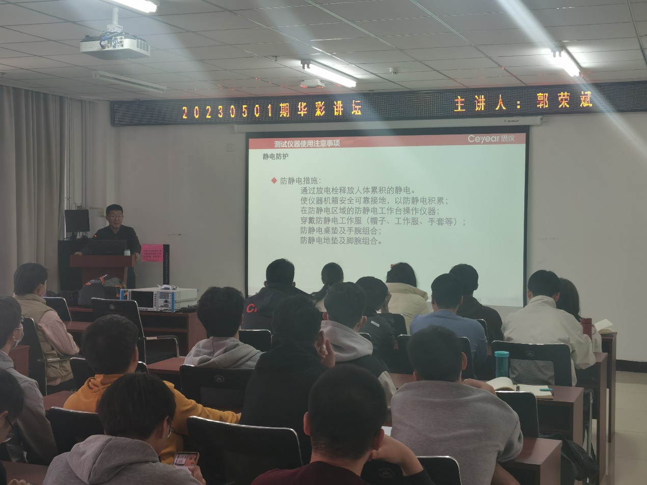 郭荣斌老师在讲座上首先普及了仪器测试使用注意事项,并重点介绍了信号频谱分析仪器的应用。通过从信号与频谱分析概念、信号与频谱分析基本原理、信号与频谱分析仪器的主要技术指标、信号与频谱分析的主要功能应用以及信号与频谱分析产品体系共五个角度,对信号与频谱分析进行了深入讲解。最后,郭荣斌老师对师生提出的问题给予了认真耐心的解答,并在现场演示频谱分析仪器的使用方法,令大家受益匪浅。