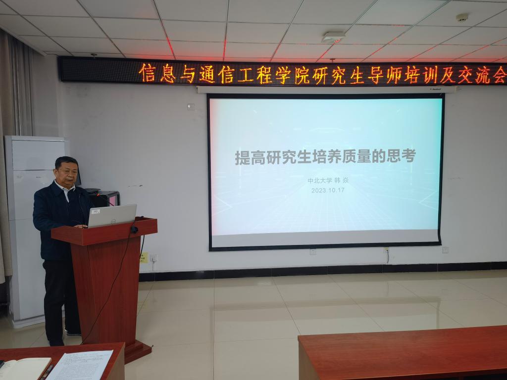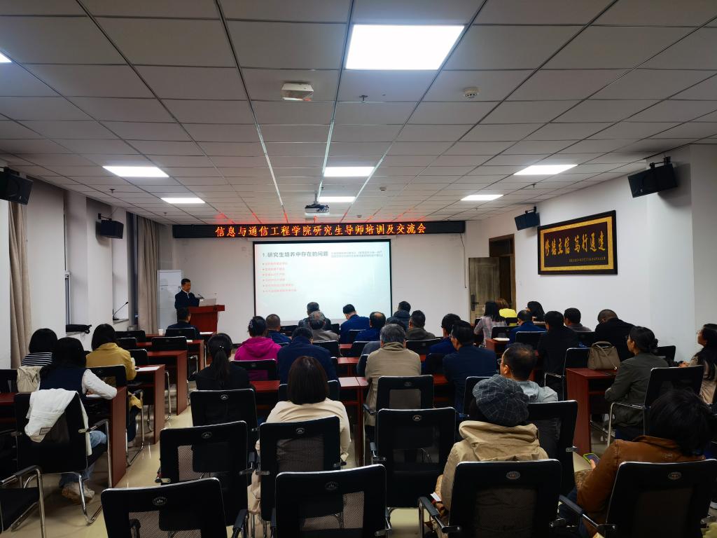 在科学楼B座715学术报告厅召开了研究生导师培训及交流会,特邀请了信息与通信工程学科首席带头人韩焱教授作为主讲,会议由学院陈平院长主持,全体研究生导师积极参加了此次活动。