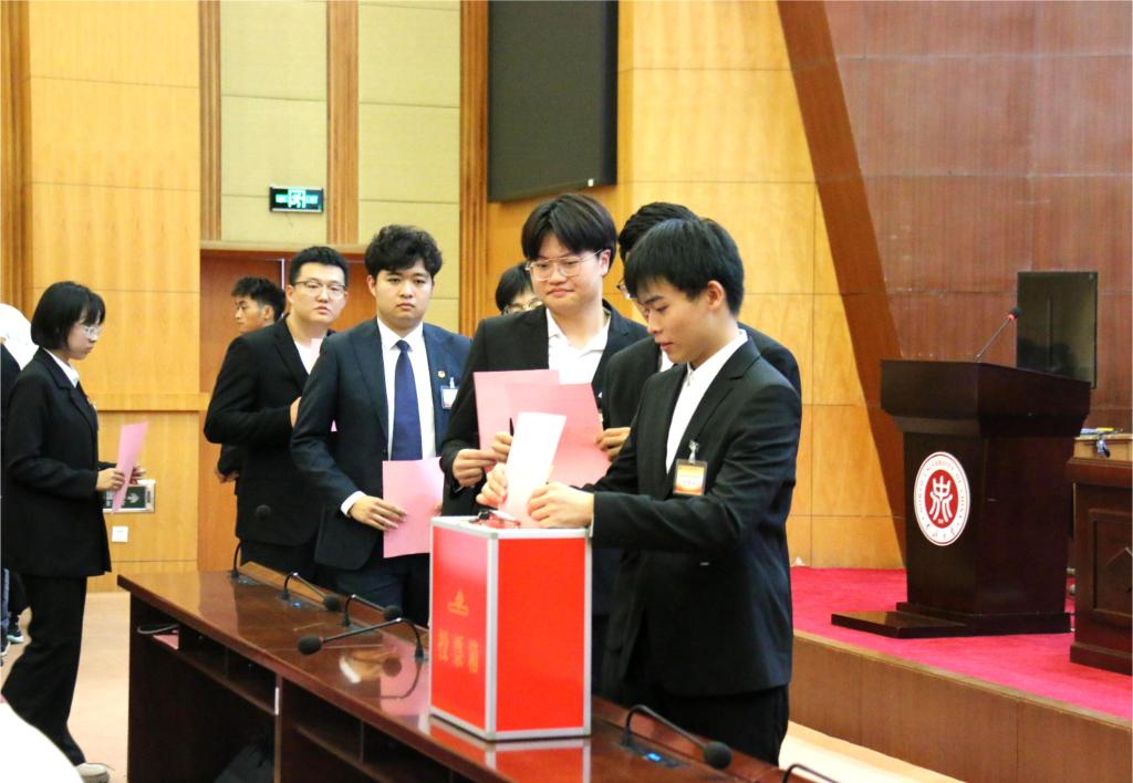 大会表决通过了总监票人、监票人,总计票人、计票人名单及选举办法,并投票选举产生了新一届学生会主席团、研究生会主席团成员和第一会所