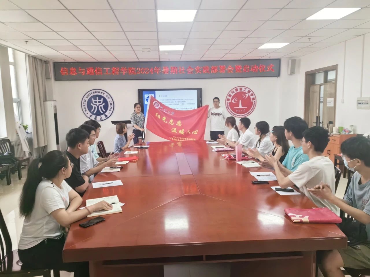 暑期社会实践队授旗,并强调道,暑期社会实践活动是贯彻落实党的教育方针的重要举措,是深化实践育人的重要载体,希望每位成员都能在实践中成长,坚持学思用贯通、知信行合一,为社会贡献力量。