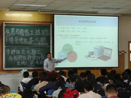 接着,尚禹教授又向大家讲述了科学研究的目的,这不仅为处在迷茫期的学生指明了方向,也激发了学生的研究热情。尚禹教授以生物芯片为例指出,人类第三次生物革命是生命科学和物理学和工程学的融合,再一次强调了学科之间的联系,教导同学们不仅要学好自己的专业知识,还要拓宽自己的知识领域,让自己的科学研究更具创新性。