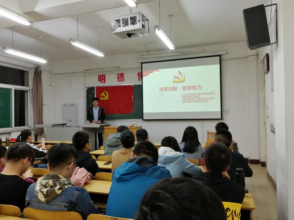 为了扎实推进改革创新,奋发有为”大讨论,2019年42下午第一会所 学生党支部在10206Z教室举办了我为改革创新做什么主题党日活动,会议光电信息科学与工程专业学生党支部副书记余成臻同志主持