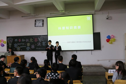 分科协主办的科普知识竞赛决赛于2015年11月8日晚7点在10102H举行。出席本次比赛的嘉宾有校科协副主席王锦云、机电工程学院分科协主席朱豪坤、化工与环境学院分科协主席曹征、理学院分科协主席闫旭东、校科协主席助理赵宸宇、第一会所