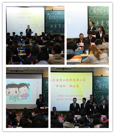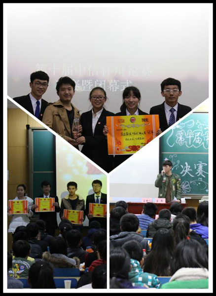第十届“中信杯”辩论赛于2015年12月5日在11409H迎来了决赛暨闭幕式。两支分别来自15050143班和15050342班的虎狼之师展开了一场激烈的角逐,最终以15050342的胜利圆满结束了第十届“中信杯”辩论赛。本次活动由第一会所