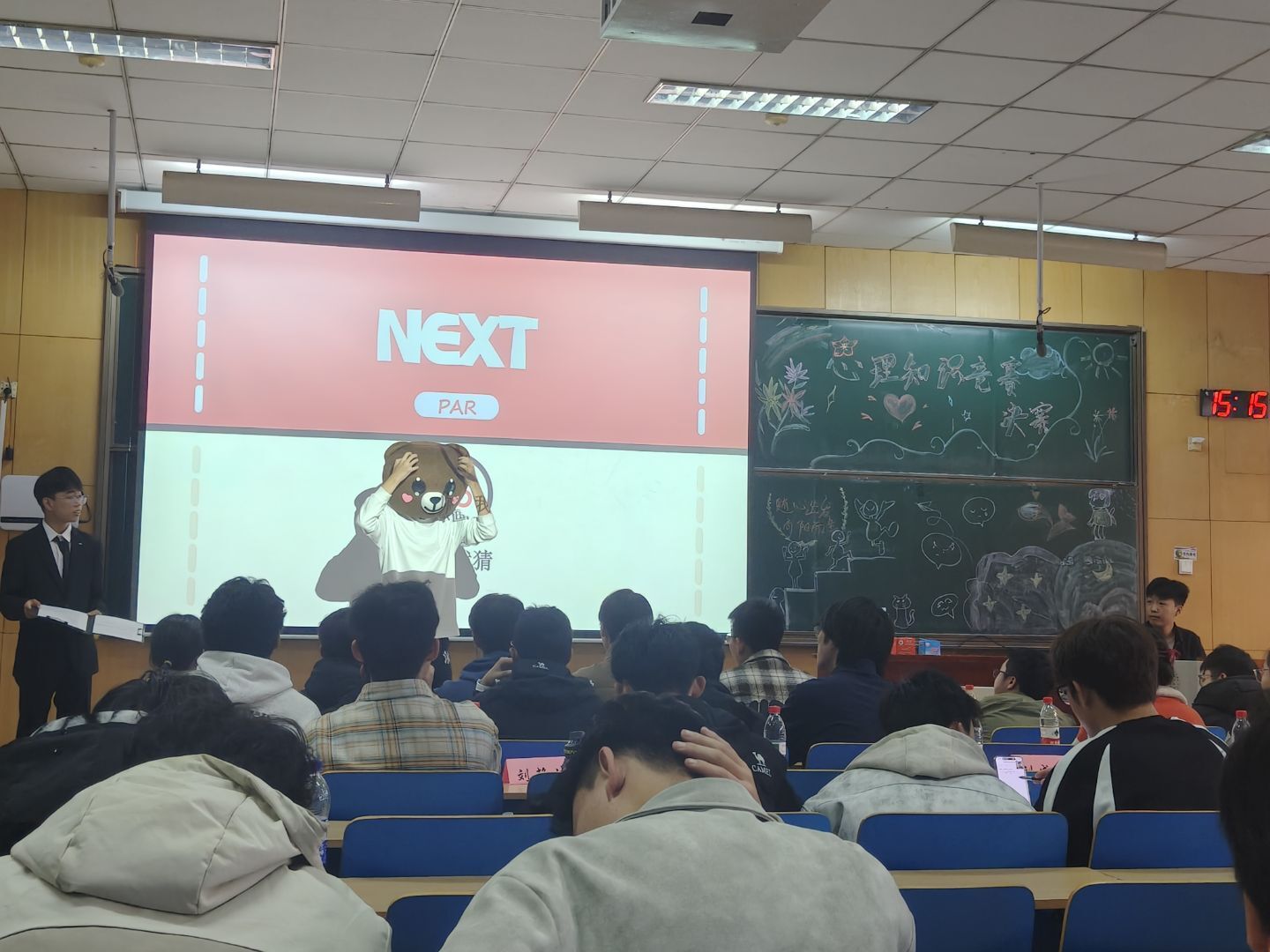 与传统知识竞赛不同,本次决赛创新性地采用组队答题模式,以团队协作的形式激发学生的参与热情。为让心理知识更易被接受和吸收,决赛题目形式丰富多样,摒弃了枯燥的纯理论题型,转而采用“你画我猜”“视频解读”“限时抢答”等学生喜闻乐见的方式,将心理健康知识融入趣味互动之中。在“你画我猜”环节,队员们凭借默契的配合,用生动的绘画和精准的猜测诠释着心理学术语;视频题环节,大家通过观看生活化的情景片段,快速捕捉心理问题关键点并给出解决方案;抢答题环节更是将现场氛围推向高潮,各队伍反应迅速、抢答果断,展现出扎实的知识储备和良好的应变能力。整场决赛既充满了紧张激烈的竞技氛围,又洋溢着轻松愉悦的互动气息,让学生在欢乐的比拼中加深了对心理健康知识的理解与记忆。