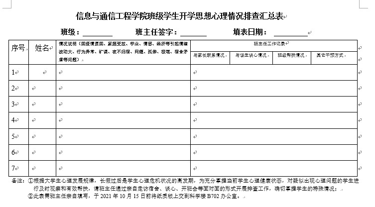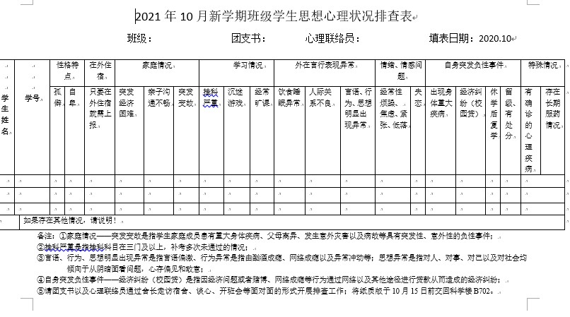 根据大学生心理发展规律,长假过后是学生心理危机状况的高发期,结合疫情防控常态化,同时充分调研我大类分流存在的问题,充分掌握疫情后时代当前学生心理健康状态,对疑似出现心理问题的学生进行及时观察和有效帮扶,我学院充分利用心理健康教育四级网络系统,组织开展摸排工作,并结合摸排结果进行分析,撰写思想排查报告,从而更好地开展心理健康教育活动。