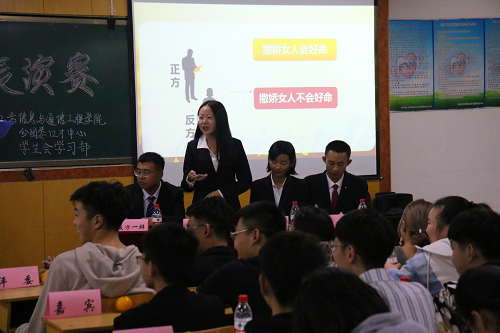,八名辩手挽着胳膊共同走进这激烈的赛场,秉承“友谊第一,比赛第二”的理念,开始了这一场友谊赛。正反方以“撒娇女人会不会好命”展开辩论。