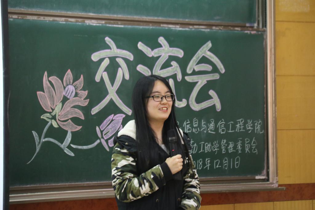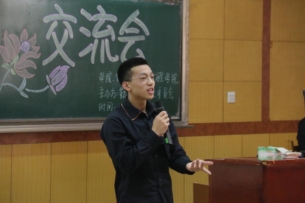 然后,我校勤工助学岗位队长代表刘倬玮同学和大家分享了他的勤工助学经历。他上岗13个月,教学楼组员1次,组长12个月,保洁2个月,他详细谈了自己在上岗过程中的所思所感。