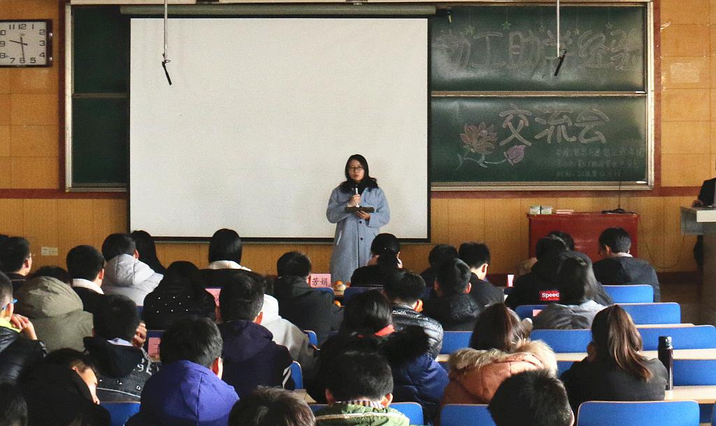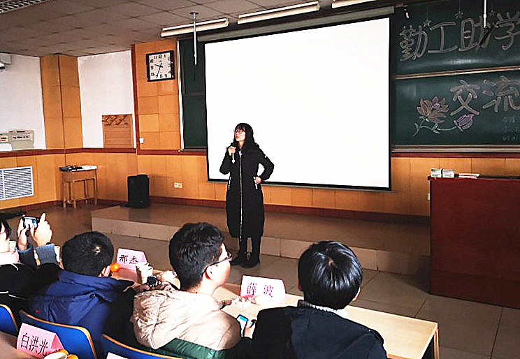 励志奖学金获得者和一位我校勤工助学岗队长和同学们进行了现场交流。