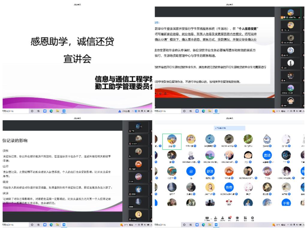 学生科沈晨老师于2022年6月2日下午通过腾讯会议在线上组织召开“感恩助学,诚信还贷”为主题的2022届毕业生毕业确认暨资助诚信主题教育大会。信息与通信工程学院2022届全体开发银行生源地助学贷款学生参加了此次会议。