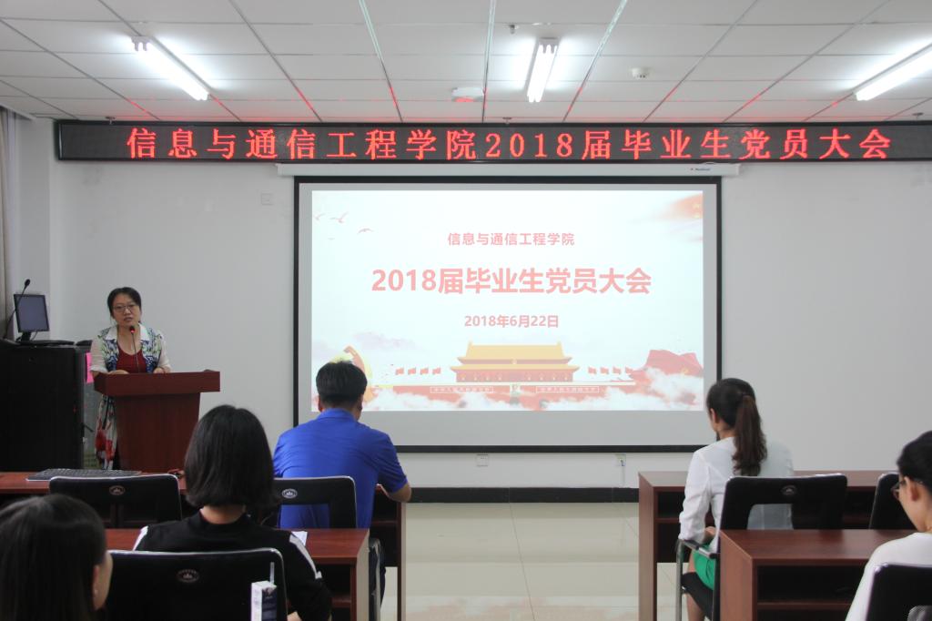 6月22上午10时,信息与通信工程学院2018届毕业生党员大会在院楼715会议室顺利召开本次毕业生党员大会以系列微党课的形式举行。院党委书记曹凤才、院长杨风暴、院党委副书记兼副院长魏媛媛、各学生党支部书记、全体2018届毕业生党员参加了本次大会,会议由院学生科科长任雁主持