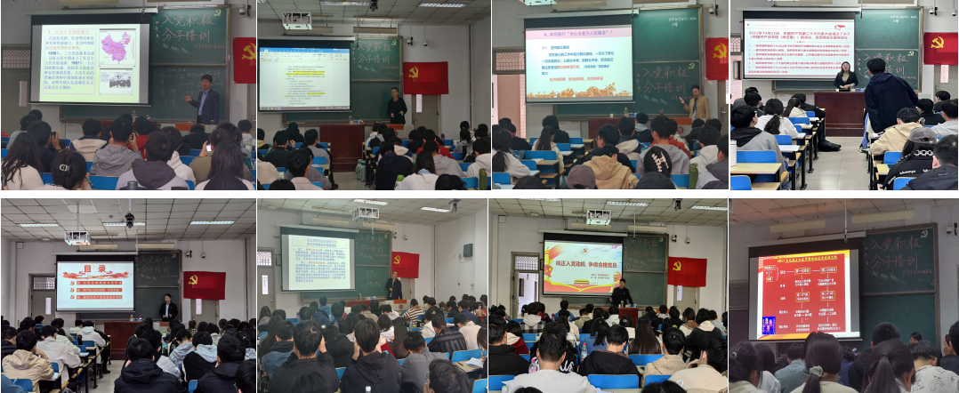 党委书记曹凤才、人文社会科学学院党委书记孙俊伟、机械工程学院党委副书记李秀玲、软件学院党委书记常旭青、航空宇航学院党委书记罗建国、经济与管理学院教授石薛桥、艺术学院党委副书记田维飞、数学学院党委书记薛亚奎分别以《党的光辉历程》、《入党流程与文书写作》、《牢记党的初心 践行党的宗旨》、《党员的权利和义务》、《对党忠诚 做合格党员》、《坚定理想信念 发挥学生党员先锋模范作用》、《端正入党动机 争做合格党员》、《党的指导思想》为题进行了专题党课讲授。