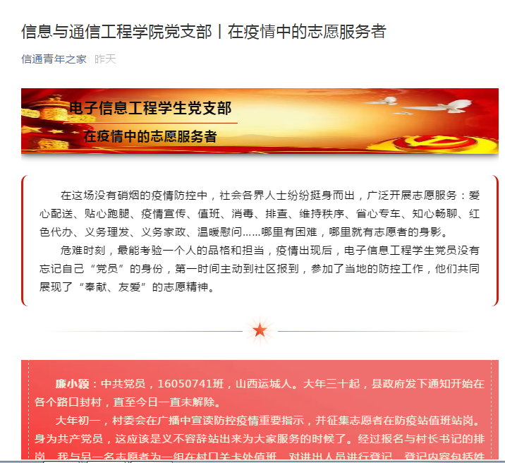同时,我支部将活动进展情况以图文形式推送到了学院公众号“信通青年之家”,营造了正面舆论氛围:尽管疫情还在,只要我们坚定信念,每个党员带头发挥不畏困难,无私奉献的精神,就一定能打赢这场阻击战。