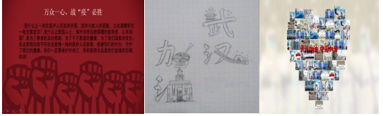 吕国瑞、王艳红、董运豪、陈照艺、王祯、李慧铮、代金波同学发挥自己的特长,通过绘画、设计海报、制作视频的方式,为武汉加油,向医者致敬。刘玥彤、徐新宇、岳军积极投身宣传工作,倡导亲朋好友积极正确防疫,共同见证春暖花开的时刻。他们在朋友圈中发布疫情的实时情况和正能量的言论,积极对疫情进行分析,并及时分享给他人,让所有人及时掌握疫情动态,坚定内心。