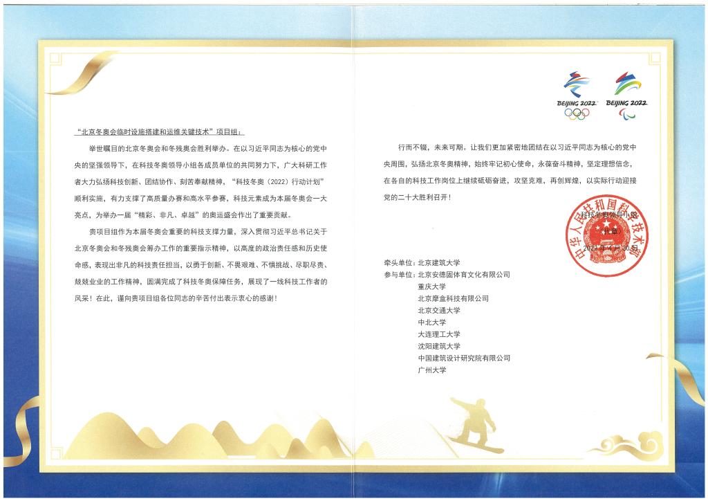 人工智能系参与的“科技冬奥”重点专项“北京冬奥会临时设施搭建和运维关键技术”项目,做出的重要贡献表示感谢。