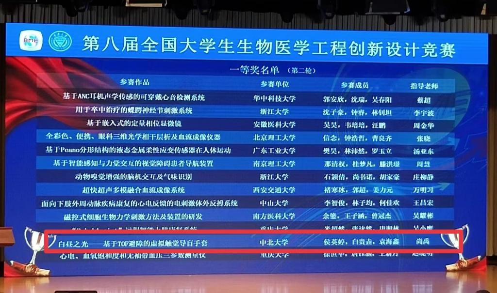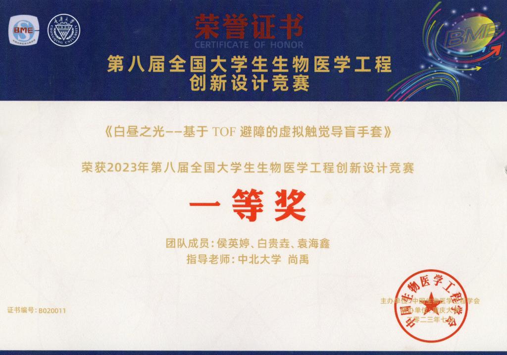 尚禹老师指导的《白昼之光——基于TOF避障的虚拟触觉导盲手套》项目,荣获本科生组国家级一等奖。此项赛事是面向生物医学工程专业本科生和硕士研究生的国家级竞赛,我校首次获得该赛事国家级一等奖。团队成员侯英婷、白贵垚、袁海鑫,均为第一会所