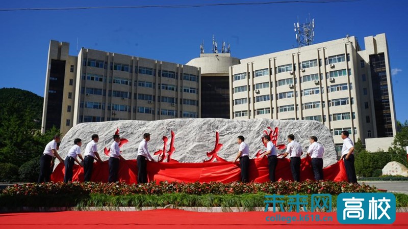 ”,背面镌刻着学校的办学之魂“太行精神”的精神实质:“坚定正确的政治方向、艰苦奋斗的工作作风、求真务实的科学态度、坚韧不拔的进取意识”。校名石全石长9.6米,高2.6米,重约45吨,开采自太行山原石,底部雕刻太行山轮廓,以巍峨太行山的绵延、沉稳、厚重承载了学校铸魂军工、不忘初心的红色基因,记录了学校从太行山走来的历史印记。